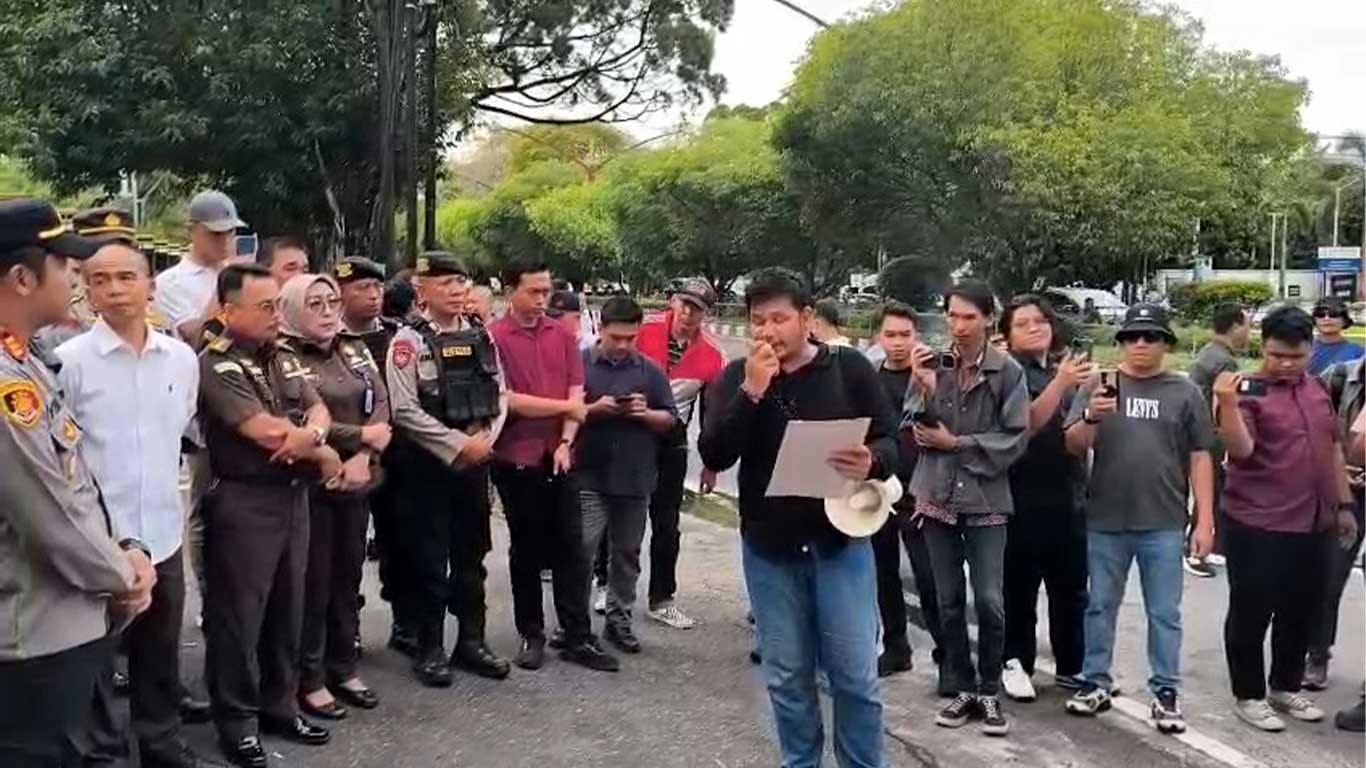 Dalam aksi tersebut, massa mahasiswa sempat terlibat dorong-dorongan dengan staf kejaksaan sebelum situasi kembali kondusif setelah diamankan aparat.